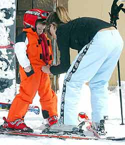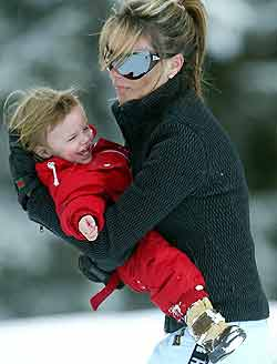 穿著一套桔黃色滑雪服的布魯克林突然開始哭起來,原來他不能從雪橇上立起身來。維多利亞彎下腰去抱了抱兒子,并幫他整理好衣服,小布魯克林又破涕為笑(見圖二)。隨后,維多利亞抱著18個(gè)月大的小兒子羅密歐在滑雪場(chǎng)的練習(xí)坡地慢慢滑行。維多利亞象蕩秋千一樣輕輕地晃動(dòng)著小家伙,直逗得他在媽媽的懷里咯咯直笑(見圖三)。