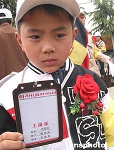 四月十日,南京火瓦巷小學生洪旻揚與其他百名志愿者在南京大屠殺遇難同胞紀念館宣誓上崗,成為這里的一百一十八志愿者之一。南京大屠殺遇難同胞紀念館自三月一日免費開放以來,接待人數比去年同期增加十倍,因此不得不向社會招募志愿者。作者:丁東升