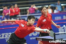 四月十二日,在北京海淀體育館進(jìn)行的奧運(yùn)會(huì)乒乓球亞洲區(qū)預(yù)選賽女子雙打第一階段比賽結(jié)束,中國(guó)選手郭躍(左)、牛劍鋒以不敗戰(zhàn)績(jī)進(jìn)入第二階段。中新社記者:盛佳鵬