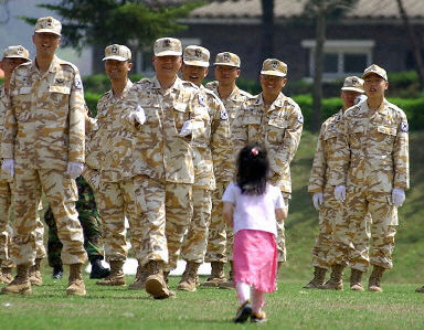 4月20日,在韓國光州舉行的赴伊拉克士兵告別儀式上,一名小女孩向他的父親告別。