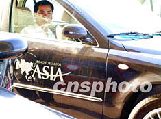 二○○四年四月二十二日,由遼寧沈陽華晨集團提供的九十七輛“中華車”穿梭于博鰲水城,為亞洲論壇年會的與會來賓、工作人員服務。“中華車”此次投入服務的主要型號為2.0和2.4兩款。圖為會議中心門前印有醒目博鰲論壇標志的中華汽車。作者:邱江波
