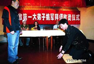 正式的拜師儀式簡短、熱烈,擲地有聲的三叩首表達了徒弟歸于師父門下的誠意,隨后,師徒二人互贈紀念品,徒弟將金畫《雄鷹展翅》贈予師父,而師父則將自己的小品專輯以及電視劇《正月里來是新春》的光碟回贈給徒弟,目的是希望他今后堅持演文明戲,演有尊嚴、有人格的作品,做一個德藝雙馨的藝人。