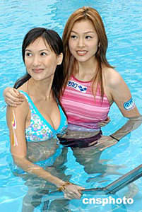 影星盧淑儀、藝員李詩蓓(右起)4月29日在香港出席國際泳裝品牌Arena 04泳裝展示派對,在水中一展豐姿。作者:鄧慶樂