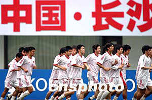 四月三十日,中國國奧足球隊在湖南長沙賀龍體育場進行場地適應性訓練,為五月一日晚迎戰韓國國奧隊做準備。中新社記者:盛佳鵬