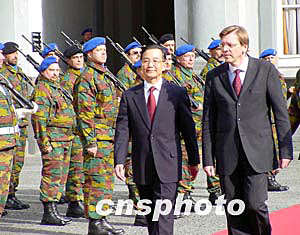 比利時首相伏思達五月五日下午舉行隆重儀式,歡迎中國國務院總理溫家寶訪問比利時。作者:蔚中