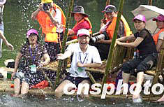 五一黃金周期間,廣東省惠州市香溪堡生態旅游景區以濃郁的嶺南風情成為旅游熱線。圖為乘坐竹筏漂流的游客戲水享樂。作者:陳文