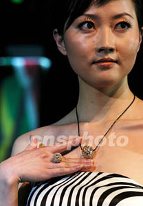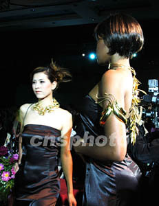 南非精美鉆石金飾展演五月初在北京進行,令北京觀眾大飽眼富。圖為中外模特展示造型別致的黃金飾品。中新社記者:王麗南