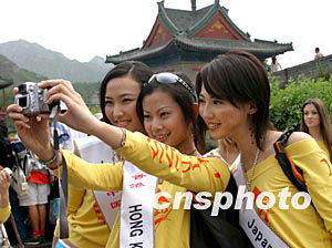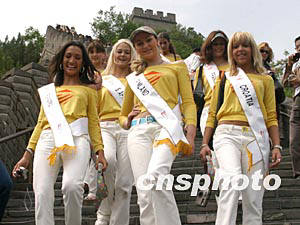 參加第十六屆世界模特小姐總決賽的世界各國參賽佳麗,五月十日在北京游覽長城,圖為佳麗們在長城留影。作者:史一博