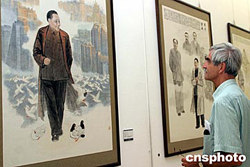 紀念鄧小平誕辰一百周年殷培華畫展八月二十日在中國美術館隆重舉行,著名軍旅畫家殷培華描繪小平輝煌而偉大一生的繪畫作品吸引觀眾。這是一位外國觀眾在認真觀賞作品《千年宏圖》。中新社記者:張勤