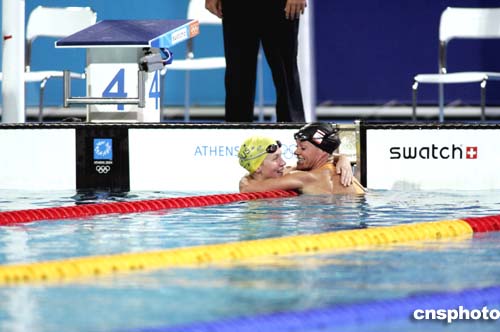 圖為在當地時間19日舉行的女子自由泳100米比賽后,荷蘭選手Inge de Bruijn擁抱獲得冠軍的澳大利亞選手Jodie Henry以示祝賀。