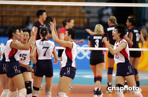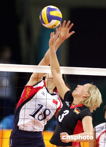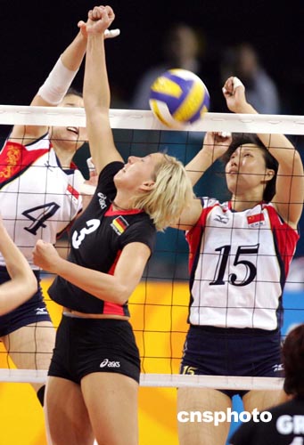 中國女排當(dāng)?shù)貢r間八月二十日上午在雅典奧運(yùn)會排球比賽中以三比零戰(zhàn)勝德國隊。中新社記者:毛建軍