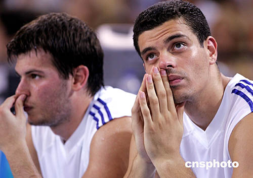 在當?shù)貢r間8月19日進行的男子籃球比賽中,希臘隊以76比98不敵立陶宛。圖為希臘隊員露出無奈的表情。