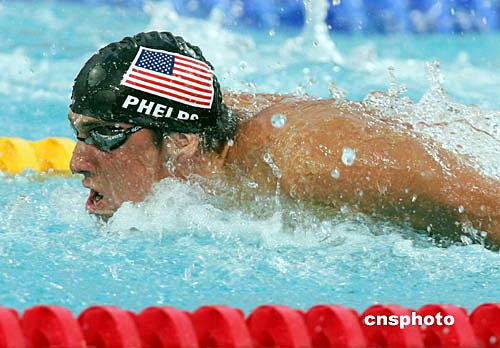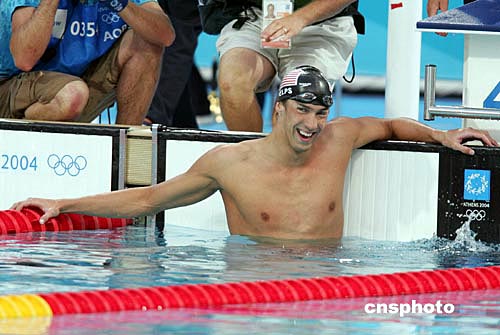 當地時間八月二十日晚,美國神童菲爾普斯在雅典奧運男子一百米蝶泳比賽中獲得金牌。中新社記者:毛建軍