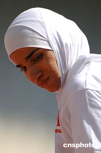 圖為巴林選手Rakia Al Gassra在女子100米比賽前觀看場地的畫面。