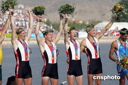 當地時間八月二十二日,丹麥選手獲得雅典奧運男子四人單槳賽艇比賽冠軍。中新社記者:毛建軍