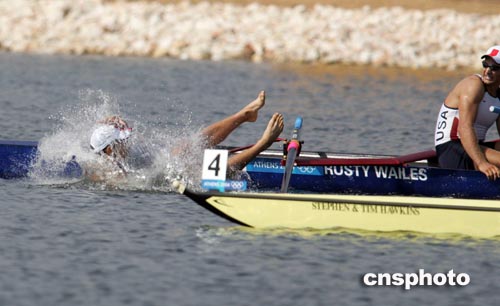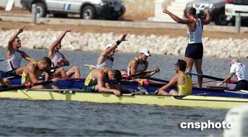 當地時間八月二十二日,美國隊在雅典奧運八人單槳有舵手比賽中得勝,隊員們到達終點高唱凱歌。中新社記者:毛建軍