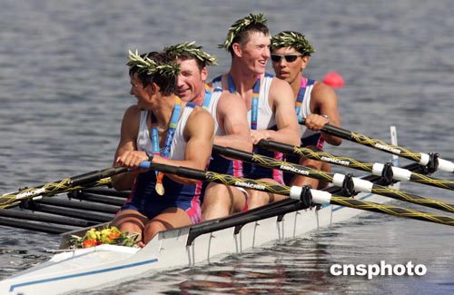 當地時間八月二十二日,俄羅斯隊在雅典奧運四人雙槳賽艇比賽中獲得冠軍。中新社記者:毛建軍