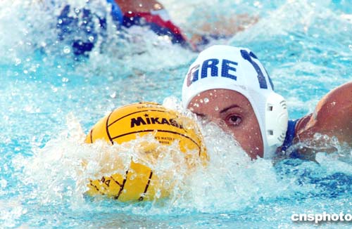 圖為當地時間22日希臘與俄羅斯在水球比賽中的爭奪。最終希臘隊以7-4取勝。