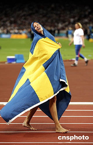 圖為瑞典選手克魯夫特(Kluft Carolina)在獲得女子七項全能冠軍后,身披國旗以示慶祝的畫面。