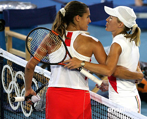 在當地時間8月21日舉行的女子網球賽中,比利時小將海寧戰勝法國名將毛瑞斯莫折桂。圖為賽后兩名選手非常友好的擁抱。
