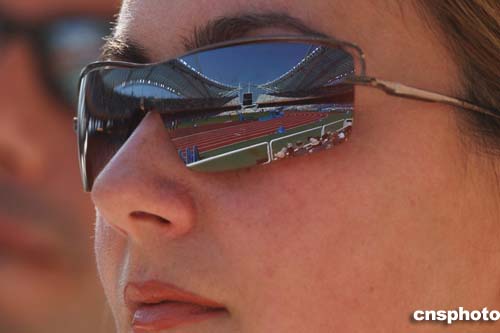 墨鏡中映射出的是雅典奧林匹克運動場田徑賽區。