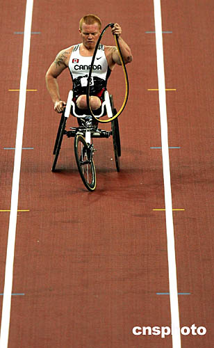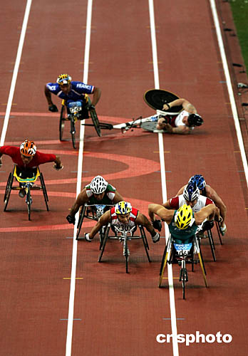 圖為在當地時間8月22日舉行的男子1500米輪椅表演賽中,加拿大選手Jeffrey Adams在摔倒在地后毅然爬起繼續比賽,體現了奧運不屈不饒的精神。