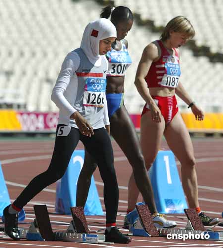 圖為當(dāng)?shù)貢r(shí)間20日,一裹著頭巾參加100米資格賽的女子。