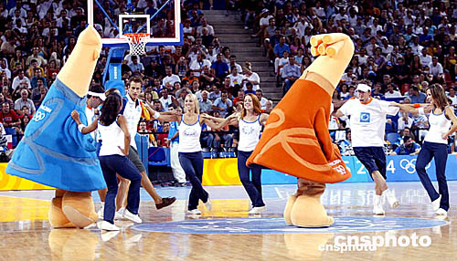 在籃球比賽現場,奧運會吉祥物“費沃斯”和“雅典娜”親臨現場和啦啦隊員們一起表演。