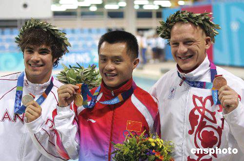 中國選手彭勃獲得雅典奧運(yùn)男子三米跳板跳水金牌,加拿大名將德斯帕蒂獲得銀牌,俄羅斯老將獲得銅牌。中新社記者:毛建軍