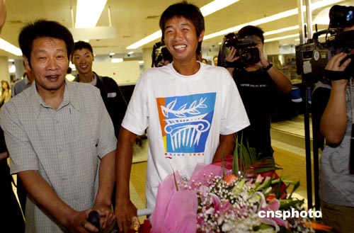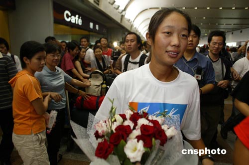 8月25日,在雅典奧運會奪得女子網球雙打冠軍的李婷、孫甜甜載譽回京,在北京首都國際機場受到熱烈的歡迎。中新社記者:盛佳鵬