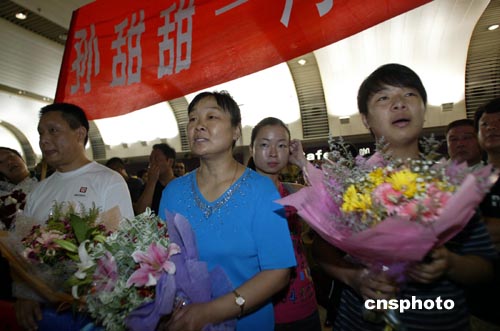 孫甜甜的母親(中)在北京首都國際機場內手持鮮花等待奧運冠軍的女兒歸來。