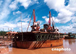 8月下旬,中鐵十四局集團三公司的工人們在呼準鐵路黃河特大橋施工現場加緊作業。呼(呼和浩特)準(準格爾)鐵路全長117公里,它的建設將為中國重要的能源工業基地----鄂爾多斯市的煤炭資源運輸開辟可靠的渠道,促進內蒙古西部地區的經濟發展。呼準鐵路黃河特大橋是全線重點工程,主體工程預計2005年10月底完成。作者:孔祥文