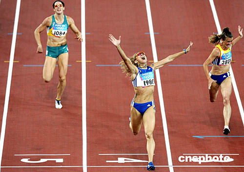 圖為希臘選手Fani Halkia戰(zhàn)勝烏克蘭的Tetiana Tereshchuk-Antipova和澳大利亞的Jana Pittman第一個(gè)沖過終點(diǎn),奪得女子400米欄的冠軍。
