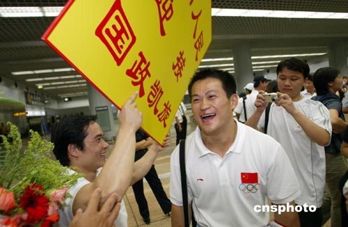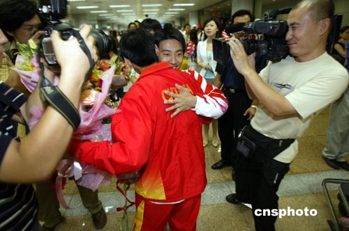 圖為雅典奧運會鞍馬冠軍滕海濱剛出機場即被迎接的隊友擁抱。