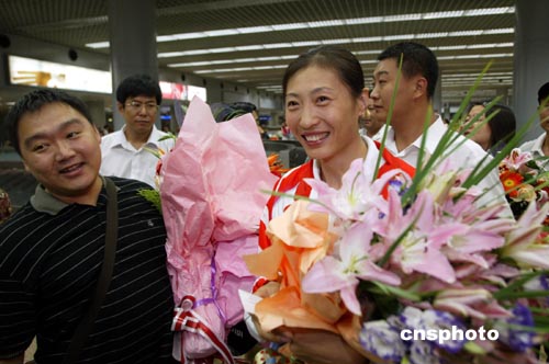 圖為奧運會羽毛球女單冠軍張寧手持鮮花走出機場。