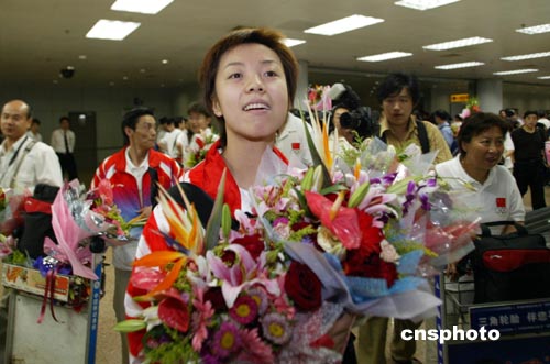 圖為雅典奧運會女子乒乓球單打冠軍張怡寧在機場手捧鮮花等待家人。