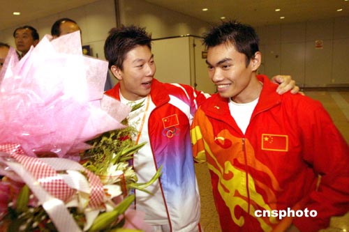 8月26日,北京首都國際機場又迎來一批載譽歸來的奧運健兒,包括羽毛球、乒乓球、游泳、體操、舉重等200多名選手,他們在機場受到英雄般的歡迎,幾乎每個人都被鮮花包圍。圖為中國體操名將李小鵬(左)在鮮花的簇擁下與前來迎接的隊友梁富亮相談甚歡。中新社記者:盛佳鵬