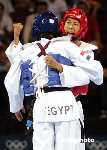 當(dāng)?shù)貢r(shí)間八月二十六日下午,在雅典奧運(yùn)會(huì)男子五十八公斤級(jí)跆拳道比賽中,臺(tái)北選手朱木炎戰(zhàn)勝埃及選手殺入決賽。中新社記者:毛建軍