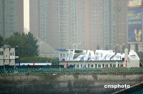 圖為中國國家游泳中心工地被摧毀的臨時設施。