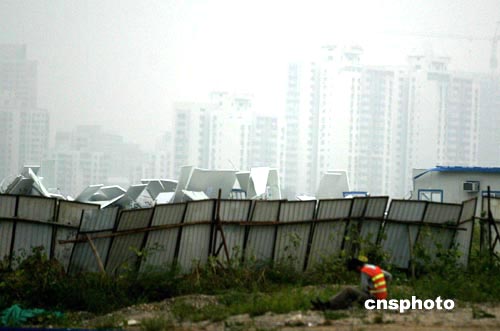 圖為工地值班人員在被旋風襲擊的工地外守候。