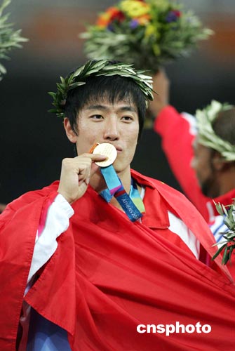 中國田徑的“希望之星”劉翔今晚再次創(chuàng)造了歷史,為中國代表團奪得了第一枚田徑男子項目的奧運會金牌!雅典當?shù)貢r間晚上九點三十分,在奧運會男子一百一十米欄決賽中,劉翔以絕對的領先優(yōu)勢一馬當先,跑出了十二秒九一的驚人成績勇奪冠軍,不僅打破了由阿蘭·約翰遜保持的十二妙九五的奧運會紀錄,還平了英國選手杰克遜的世界紀錄。
