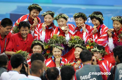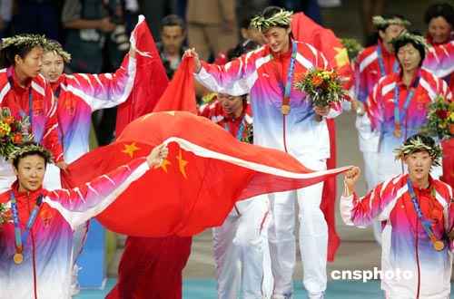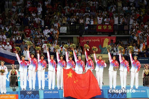 當地時間八月二十八日晚,在雅典奧運會女排決賽中,中國女排在先失兩局的情況下,連續扳回后三局,最終以三比二戰勝俄羅斯隊而獲得冠軍。中新社記者:毛建軍