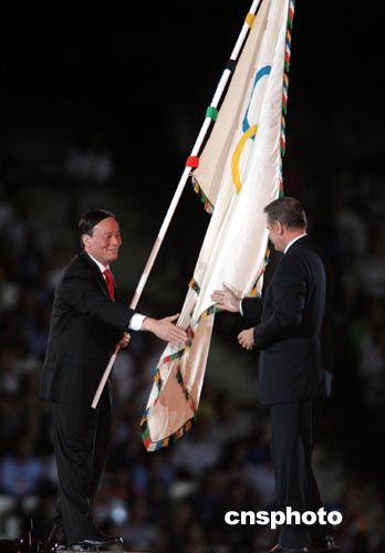 羅格說,“四年后,讓我們在北京相聚。”他從雅典市長巴科揚尼斯手中接過奧運會會旗,然后把會旗交在北京市市長王岐山手中。