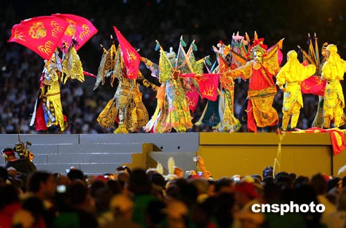 展現中國文化,京劇不可或缺。來自大連的十三歲少年汪宇,與另外五名同學揮舞旌旗表演了武戲。隨后,一個巨大的紅燈籠狀舞臺緩緩升起,一名中國小女孩清唱《茉莉花》,“welcome to beijing”,她純真、清脆的聲音表達出中國人民最衷心的愿望。
