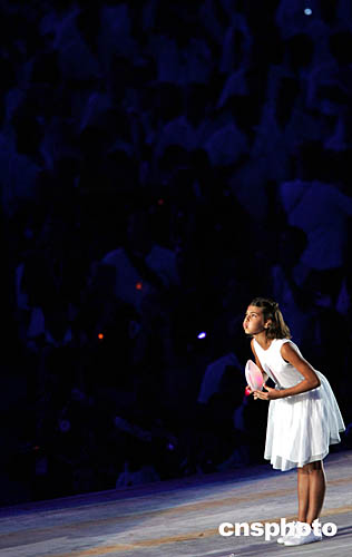 圖為在閉幕式上,一個小女孩象征性的一吹,吹滅了奧運圣火的鏡頭。