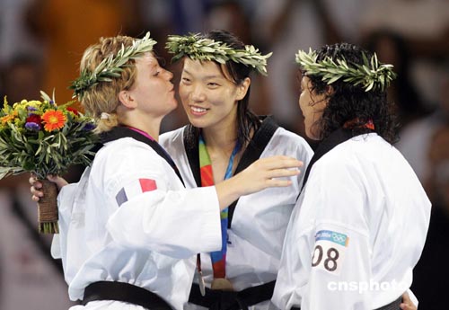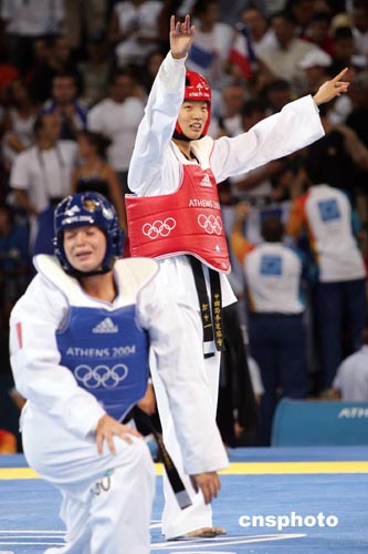 當地時間八月二十九日,中國選手陳中在雅典奧運女子六十七公斤以上級跆拳道決賽中戰勝法國選手獲得冠軍。中新社記者:毛建軍