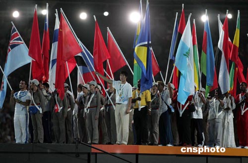 雅典當地時間八月二十九日晚,雅典奧運會閉幕式在奧林匹克主體育場隆重舉行,在本屆奧運會奪得男子110米欄金牌的中國飛人作為中國體育代表團旗手,步入會場。中新社記者:毛建軍