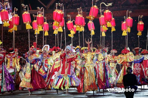 圖為中國演員在閉幕式上表演,宣傳將于二00八年在北京舉行的下一屆奧運會。