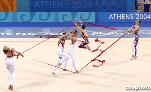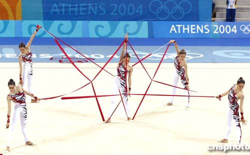 圖為意大利隊在藝術體操集體全能比賽中的精彩表現(xiàn),她們獲得該項目的銀牌。