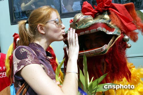 模特在杭州與舞獅親密接觸。8月30日,參加2004年新絲路世界模特大賽的二十九個國家和地區(qū)的四十多名選手齊聚杭州,開始她們的時尚之旅。近年杭州強力塑造“時尚旅游城市”形象。中新社記者:盛佳鵬